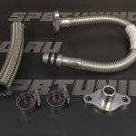 Использование стальной гофрированной трубки гарантирует надежность слива и возможность пропустить его между раннеров коллектора или около горячей части турбины без страха повреждения от высоких температур. Не забывайте, первая половина слива должна быть строго вниз). Для соединения с блоком необходимо использовать отрез шланга AN12 в стальной оплетке. Необходимую длину можно скорректировать турбинкой. Концы шланга можно зачистить для фиксации хомутами